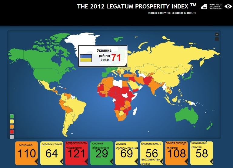 В рейтинге Legatum Institute Украина разместилась на 71 позиции, пропустив вперед Ботсвану (70), Колумбию (69) и Парагвай (68). Следом за Украиной идут Перу (72), Марокко (73) и Южная Африка (74).